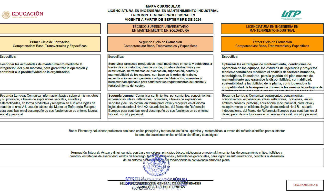 El egresado de Licenciatura en Ingeniería en Mantenimiento Industrial se distingue por poseer las competencias profesionales esenciales que respaldan su desempeño con éxito en el dinámico entorno laboral, abarcando tanto el ámbito local como el regional y nacional. Este perfil integral no solo se ajusta a las demandas actuales del sector, sino que también anticipa y se adapta a las transformaciones y desafíos emergentes de la Licenciatura en Ingeniería en Mantenimiento Industrial. Su capacidad para integrar conocimientos técnicos especializados, habilidades analíticas y una visión innovadora lo posiciona como un profesional altamente cualificado y preparado para contribuir significativamente al avance de la disciplina y a la resolución eficiente de problemáticas complejas en distintos contextos.