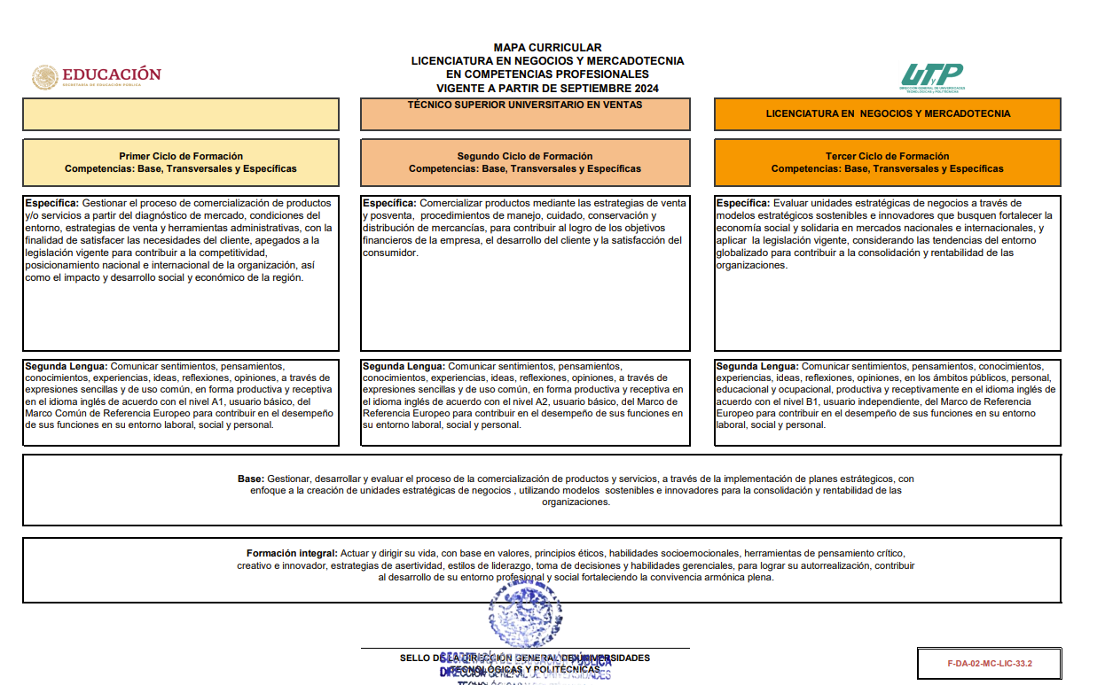 El licenciado en Negocios y Mercadotecnia se distingue por poseer las competencias profesionales esenciales que respaldan su desempeño con éxito en el dinámico entorno laboral, abarcando tanto el ámbito local, como el regional, nacional e internacional. Este perfil integral no sólo se ajusta a las demandas actuales del sector, sino que también anticipa y se adapta a las transformaciones y desafíos emergentes de la Licenciatura en Negocios y Mercadotecnia. Su capacidad para integrar conocimientos técnicos especializados, habilidades analíticas y una visión innovadora lo posiciona como un profesional altamente cualificado y preparado para contribuir significativamente al avance de la disciplina y a la resolución eficiente de problemáticas complejas en distintos contextos.